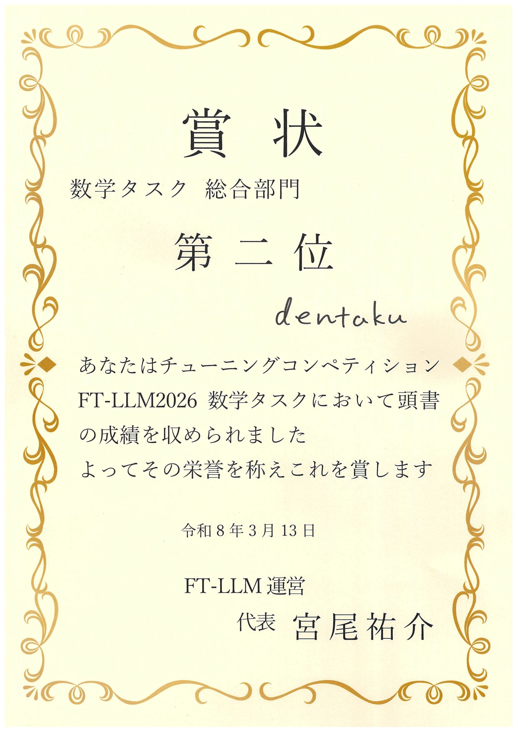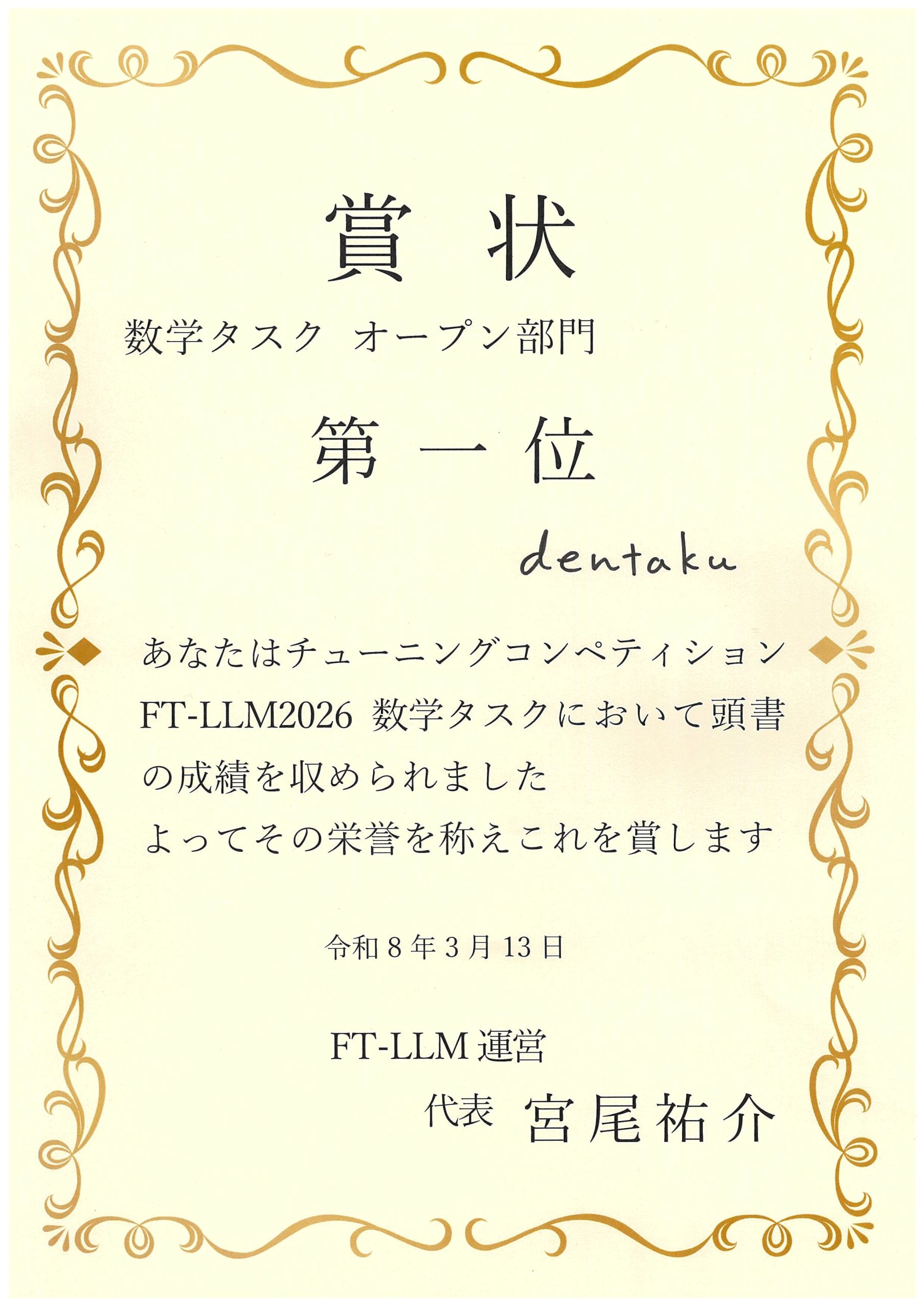 Awarded 1st place in the Open Division and 2nd place in the Overall Division at the FT-LLM2026 Mathematics Task / FT-LLM2026 数学タスクにてオープン部門 1位・総合部門 2位を受賞