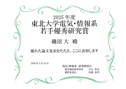 磯沼大特任助教が2025年度東北大学電気・情報系若手優秀研究賞を受賞しました。おめでとうございます!