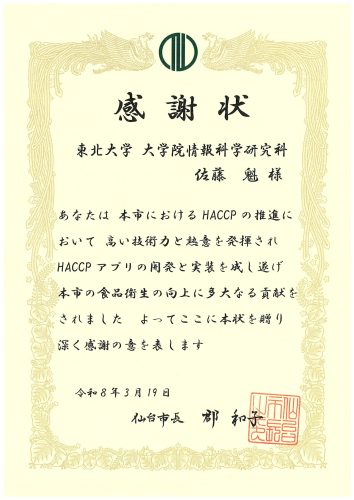 佐藤魁(博士1年)が小規模飲食店等の衛生管理を支援する「仙台市HACCP管理アプリ」を開発し、仙台市より感謝状が贈呈されました。おめでとうございます!